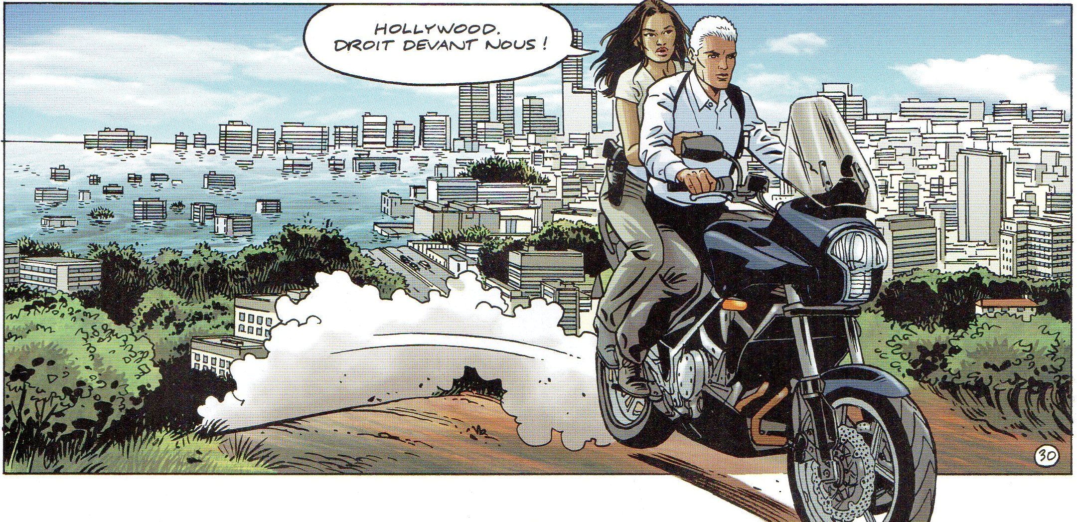 - Je suis moins convaincu par mon propre travail sur ce tome 7 que par celui que j’ai accompli sur le tome 5. Je n’étais pas à l’aise avec la scène du tsunami qui ravage Los Angeles (en particulier en pl. 23-25), et ça se sentirait encore plus à la lecture si le talent de Bruno Pradelle n’avait pas en partie rattrapé le coup ! À ma décharge, le grand spectacle n’est pas le domaine dans lequel j’excelle. Daniel Koller, dans le tome 6, avait dessiné un tsunami sur Rio autrement plus époustouflant que le mien!