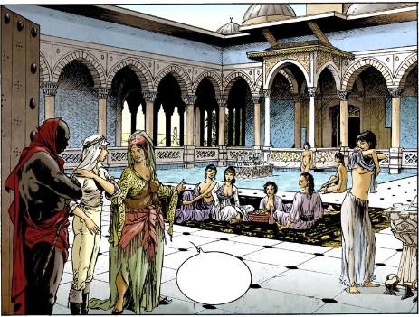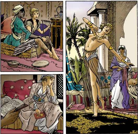 Passage obligé du voyage d'Artémis en Egypte: le harem ! Grand amateur des peintres orientalistes, Franck s'est régalé à dessiner le séjour forcé de notre jeune héroïne dans le harem de Mehemet Ali...