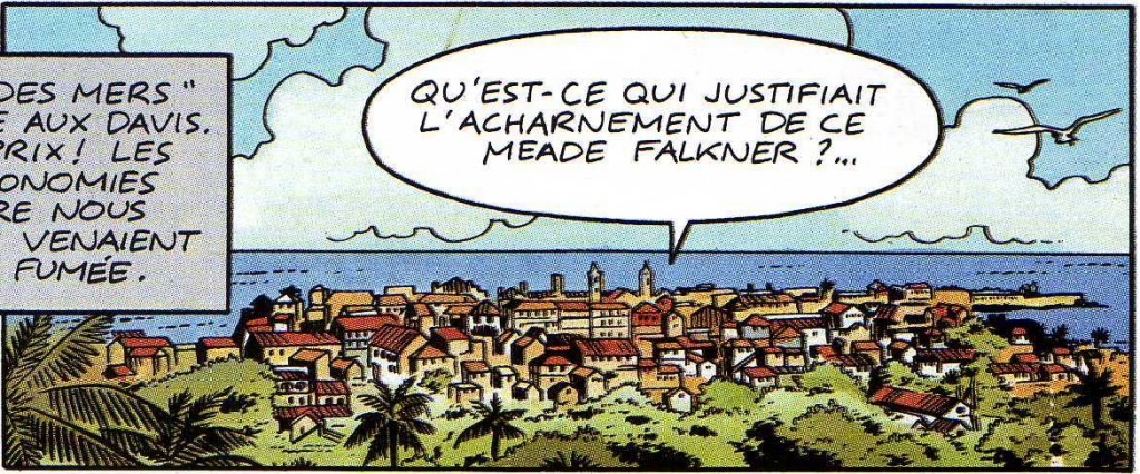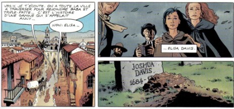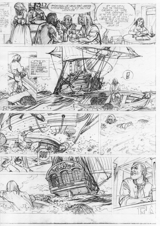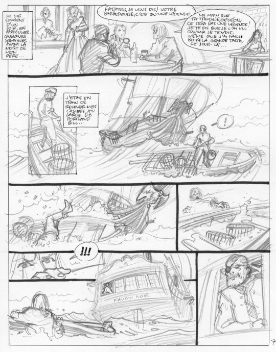 Le secret d'Elisa Davis 1ère partie est l'album dont je suis le plus fier graphiquement. Il faut dire que j'avais à illustrer un superbe scénario, subtil et audacieux (Barbe-Rouge en est presque totalement absent et il ne comporte aucune scène maritime, ou presque). S'inspirant ouvertement du roman Moonfleet de J. Meade Falkner, Christian Perrissin raconte l'enfance d'Anny Read, la compagne de Barbe-Rouge, en Cornouailles. En parallèle, il narre l'errance d'Eric, Anny, Triple-Patte et Baba dans la jungle péruvienne. Deux ambiances très différentes, que je me suis régalé à dessiner.