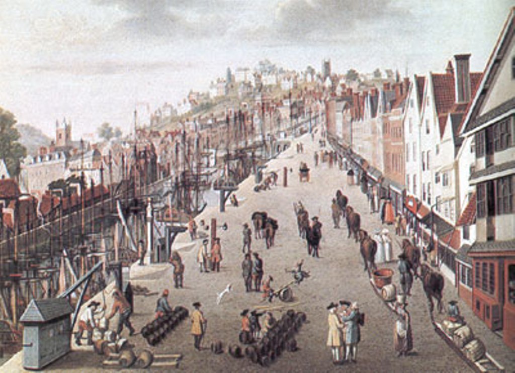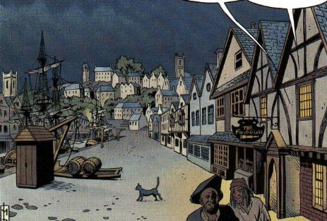 La documentation n'est pas facile à trouver pour ce qui concerne la période dans laquelle évolue Barbe-Rouge (vers 1740). Prenons Bristol, où échoue Elisa après la mort de sa mère. Ce port anglais situé dans les terres a tant changé en deux siècles et demi qu'il est impossible de se baser sur son tracé actuel pour retrouver son aspect d'autrefois. Il m'a donc fallu imaginer le Bristol de cette époque à partir du tableau ci-dessus.