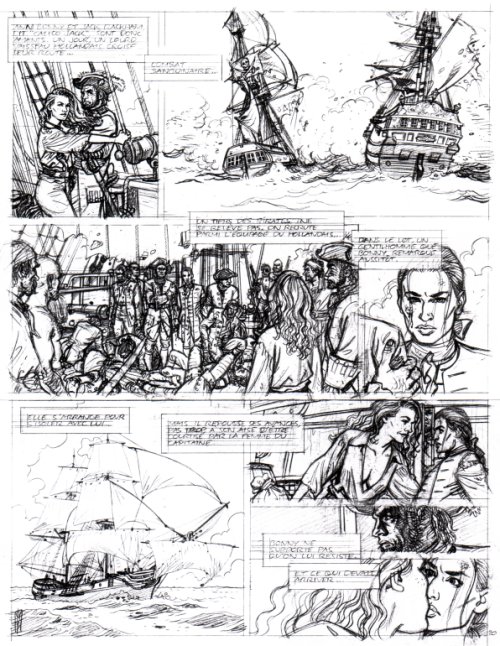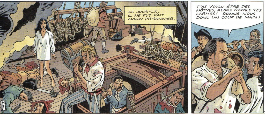 Pour s'occuper l'esprit, Anny entreprend de raconter la suite de sa rencontre avec Barbe-Rouge, quand elle n'était encore qu'Elisa Davis... c'est ainsi qu'on apprend comment elle est parvenue à se glisser parmi le nouvel équipage du "Faucon Noir". Baptême du feu au large des côtes normandes. Elisa découvre la réalité de la piraterie : pas de quartier.
