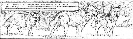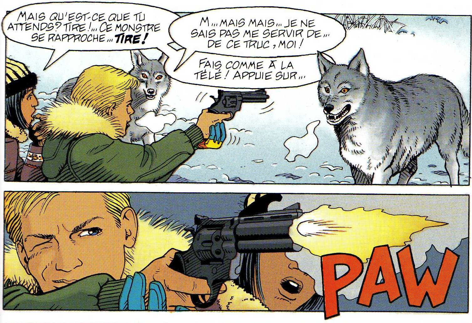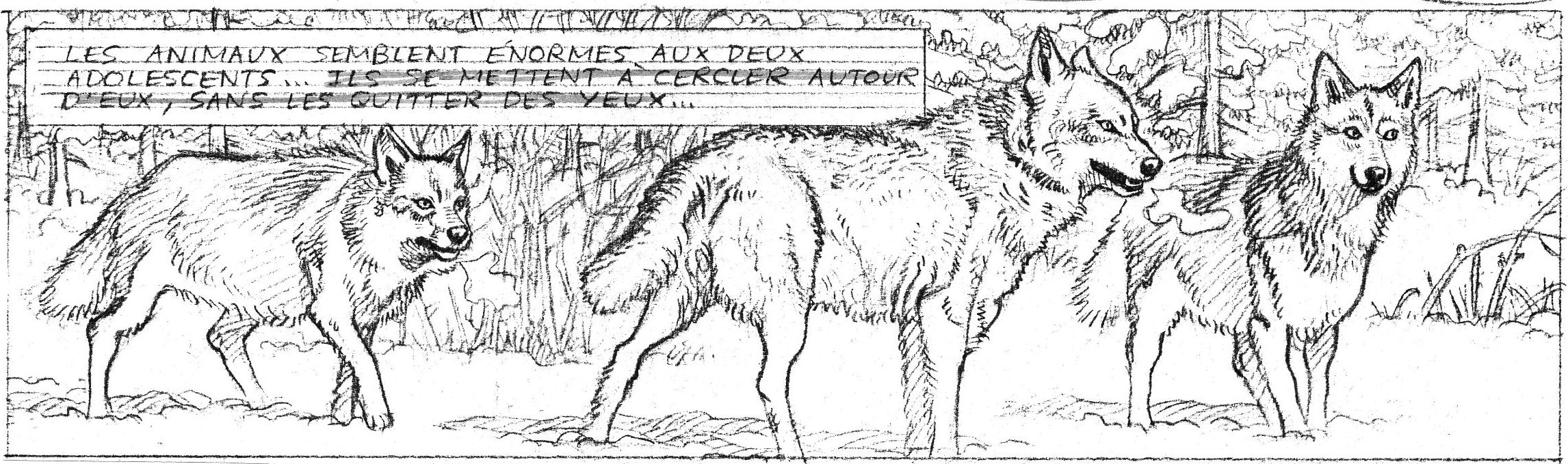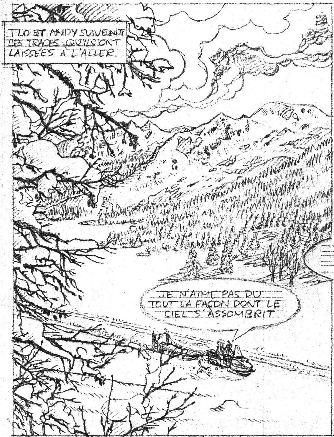 Le deuxième Etre libre est l'album le plus raté de toute ma bibliographie! Peut-être a-t-il tout de même quelques qualités, mais comme il est au dessus de mes forces de le relire... Le dessin est plat et sans vie, les décors pratiquement vides, les mises en pages sans invention. Le scénario est mal fichu et plein de scènes sont parfaitement invraisemblables. En plus, j'y place Flo et Andy sous la menace d'une meute de loups, alors que ces animaux n'attaquent en réalité jamais les hommes... À ce propos, j'ai toujours été étonné qu'Etre libre soit souvent considérée comme une BD écologiste, alors que cette série présente principalement la nature sauvage comme une source de danger et alors que nombre d'animaux y sont abattus sans état d'âme (Andy tue l'un des loups d'un coup de revolver!).