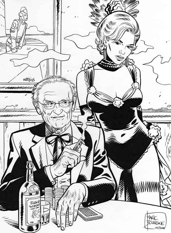 J'ai dessiné Jean Giraud-Moebius en compagnie de Chihuahua Pearl (personnage de Blueberry), pour une exposition-hommage en 2008
