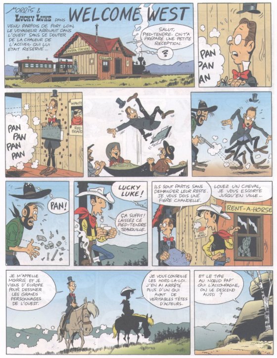 J'ai dessiné également deux planches dans l'album Hommage à Morris (GEM'S Editions 1999). L'éditeur nous avait demandé d'imiter le style de Morris. Un exercice de style amusant, mais un peu malhonnête...