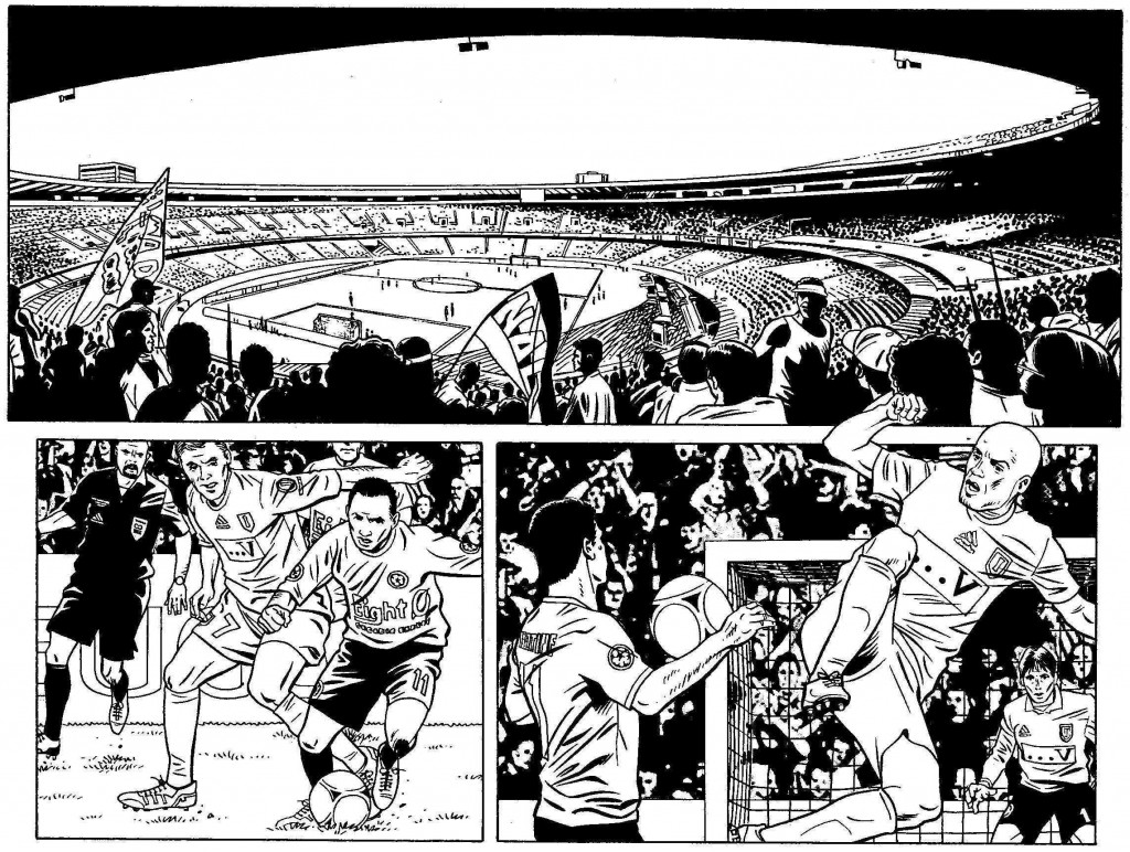 Illustrer un scénario aussi carré, varié et captivant que celui de IRS Team est un vrai plaisir. Impossible de s’ennuyer! Pourtant, et contrairement à Stephen qui est un footeux (déçu par certaines dérives), je ne m’intéresse pas au football. Mais dessiner des joueurs en action est très plaisant: dommage qu’il n’y ait pas plus de matches dans l’album!