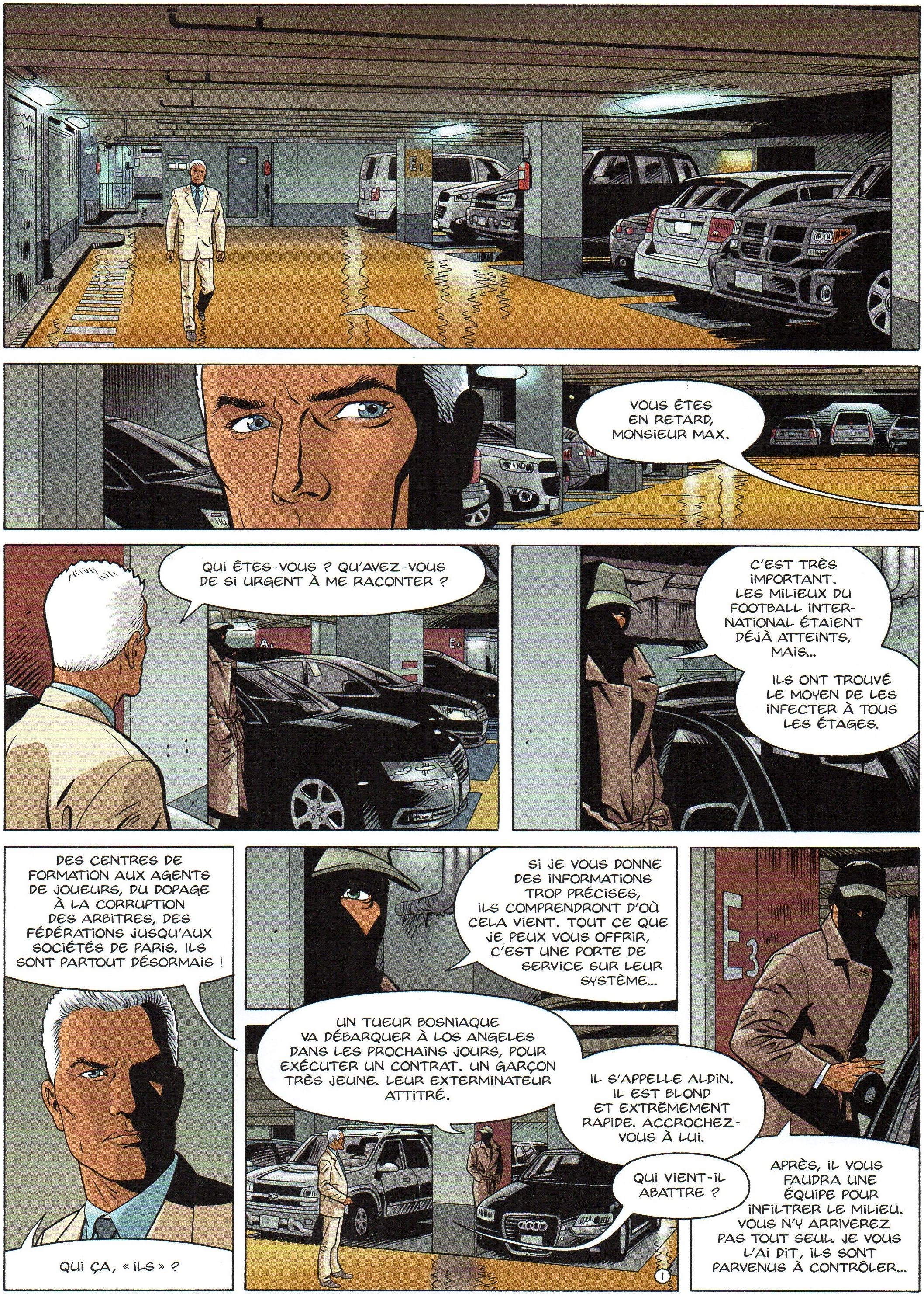 Le métier de Stephen Desberg m’impressionne toujours. Lisez la première planche de l’album (ci-dessus): Stephen y présente le personnage principal (le héros inflexible Larry Max), donne le thème de la série (la corruption du football international), explique la situation (un tueur va arriver) et dévoile la future intrigue (Larry va créer une équipe pour infiltrer le milieu du foot)!