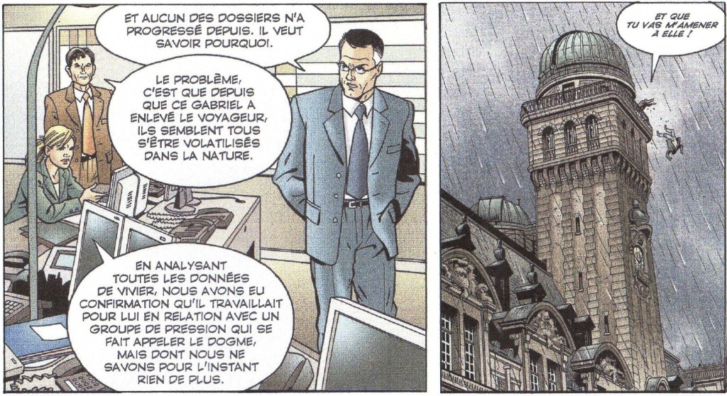 La doctoresse Clara, même teinte en blonde, est toujours aussi mal embouchée et antipathique: on se demande ce que Vedder peut lui trouver et on n'éprouvera pas de tristesse à la voir abattue dans la dernière page. Le duo de flics, sorte de Mulder et Scully à la française, ont comme d'habitude un métro de retard. Vedder, le "voyageur", après avoir passé les trois premiers tomes à subir l'intrigue plutôt qu'à agir, se décide enfin à affronter son alter ego, Fish... Mais il est vite balancé dans le vide!...