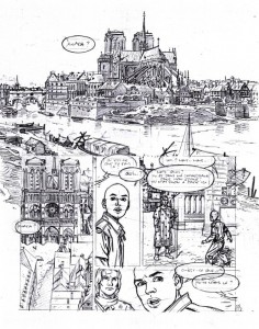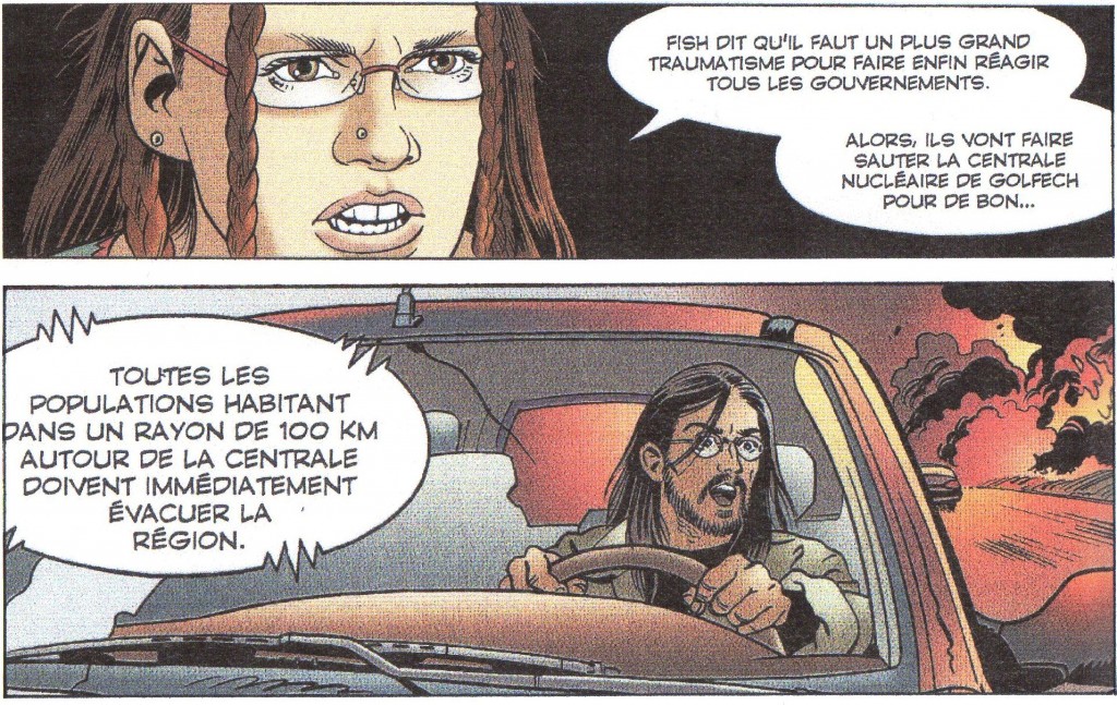 En recevant le scénario des dernières planches, je me suis permis d'exprimer mon désaccord à Pierre Boisserie: je ne comprenais pas pourquoi la jeune Solène vendait Fish à la DCRI. Depuis le début, elle était la plus fanatique des jeunes du groupe V, d'autant plus qu'il semblait assez évident qu'elle était amoureuse de Fish. Alors pourquoi le trahir? Ca n'avait aucune logique. Nicolas, le petit ami de Solène, aurait eu, lui, une motivation, pour trahir Fish: la jalousie (c'était d'ailleurs lui le traître dans le synopsis initial). Kevin, en perpétuel conflit avec Fish, aurait pu, lui aussi, incarner le traître. Mais non! Pierre m'a demandé de me mêler de mes affaires, et j'ai juste essayer de rattraper un peu le coup dans mes dessins: j'ai donné un air provocateur à Solène lorsqu'elle trahit Fish, alors que le scénario la décrivait en larmes. Et j'ai permis à Kevin d'échapper à l'explosion de la centrale nucléaire, alors que dans le scénario, il se faisait bêtement abattre comme les autres par le GIGN.